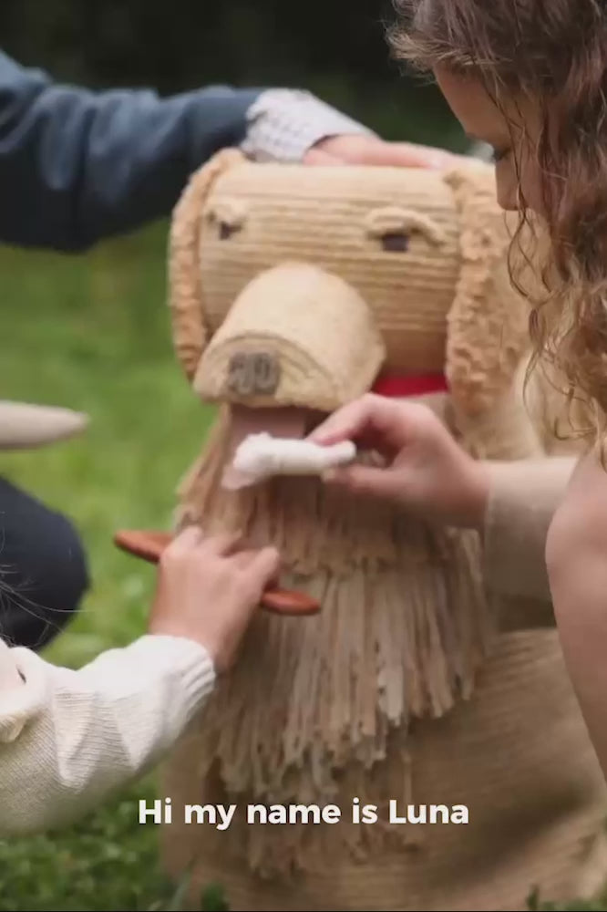 Meet Luna and give her a big hug! The cuddliest companion and your favorite storage buddy. This is the largest handmade basket in the Lorena Canals collection, inspired by the friendly silhouette of a Golden Retriever. Discover her playful details: canvas-lined ears, hand-knotted eyes with fluffy eyebrows, an interactive snout with a roll-out tongue, and a movable mouth. She even comes with a little toy bone attached to the label and a red collar for that final heartwarming touch.